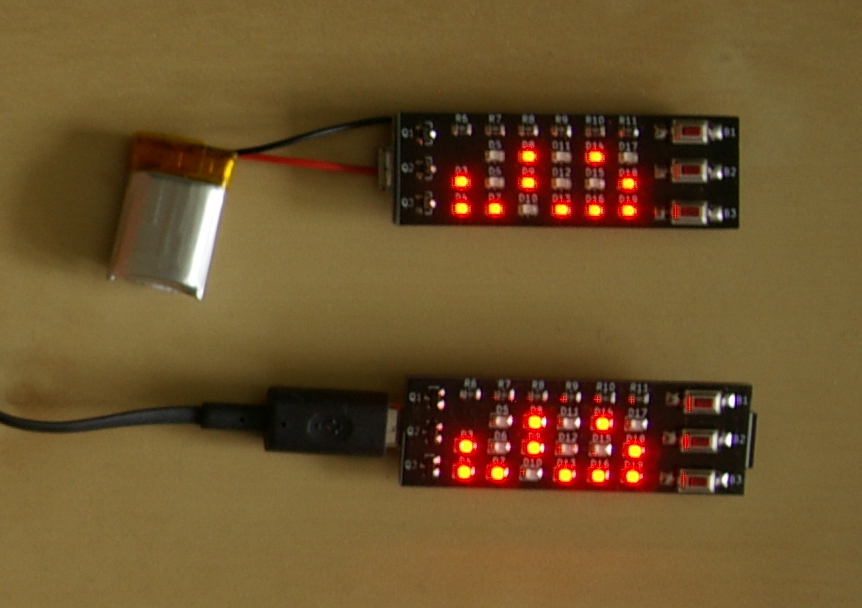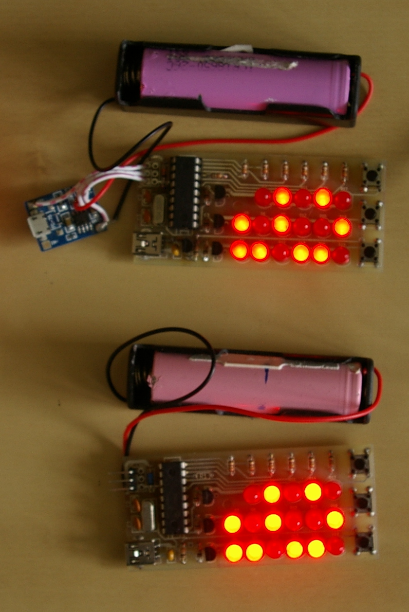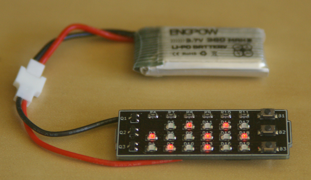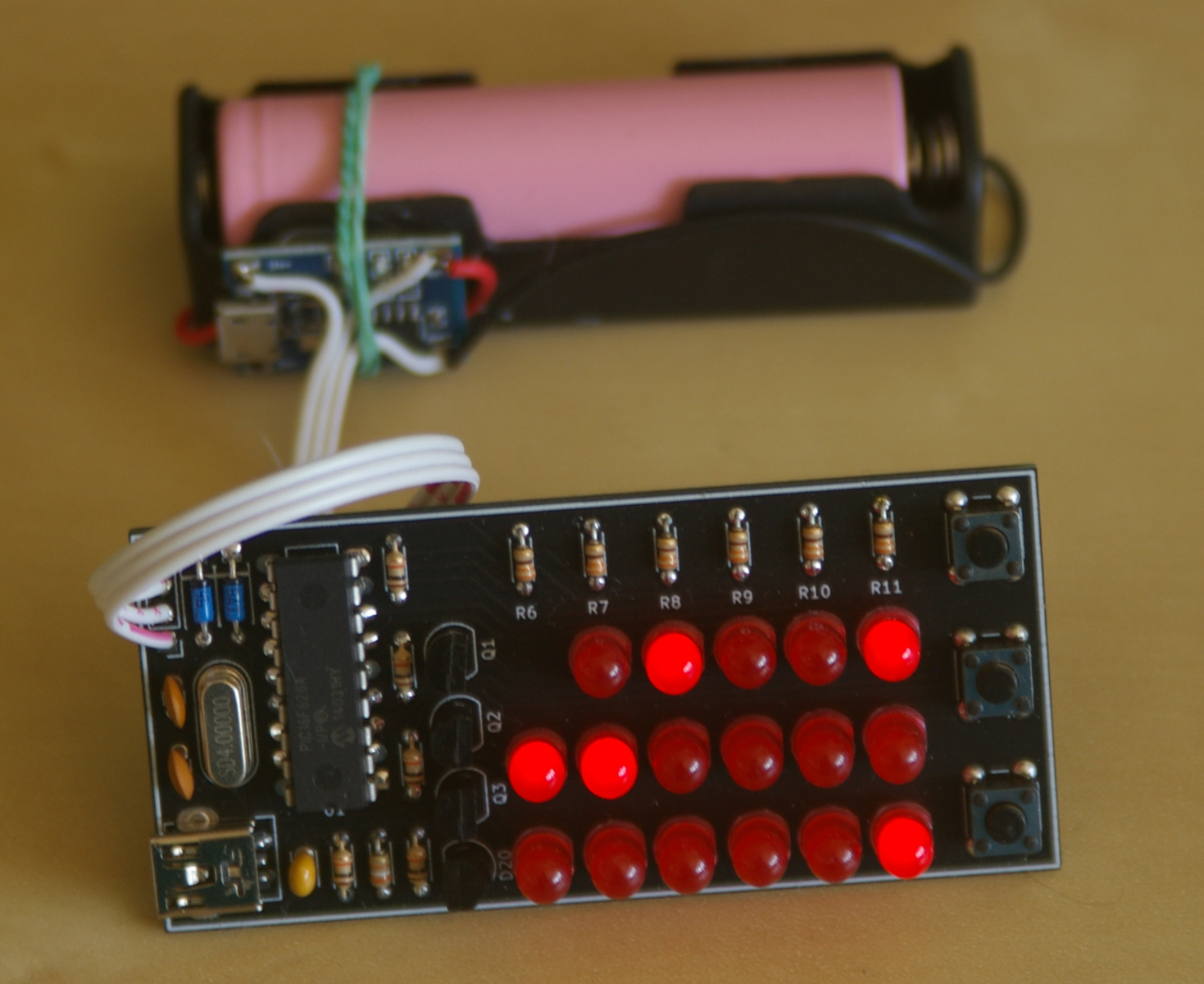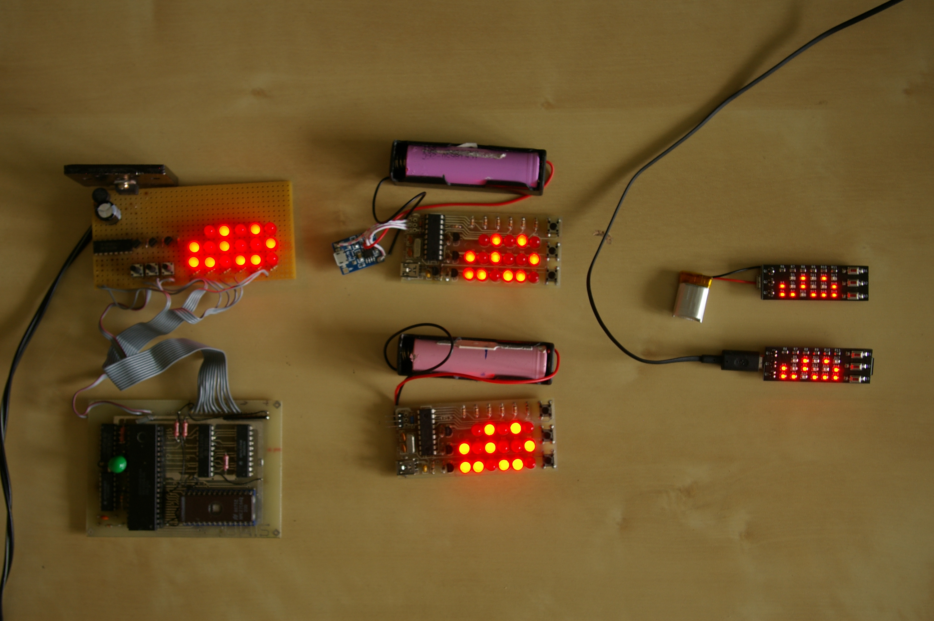 A fő problémám ezzel a panellal az volt, hogy összesen csak nyolc adatkimenete van. Hát hogy fogok 17 LED-et meghajtani 8 biten!? Ha kötök egy kis kompromisszumot, és az óra nem 24-ig fog járni, hanem csak 12-ig, akkor elég lenne a 8 bit is, egy 4x4-es mátrixba kapcsolva a 16 LED-et. De én 24 órás órát akartam! Szóval valahogy ki kellett terjesztenem a 8 bitet. A megoldás az lett, hogy az alsó 6 bit mutatja a bináris képet, míg a felső kettő vezérli a sorokat. A három sorhoz egy demultiplexer áramkört építettem be (74LS138).