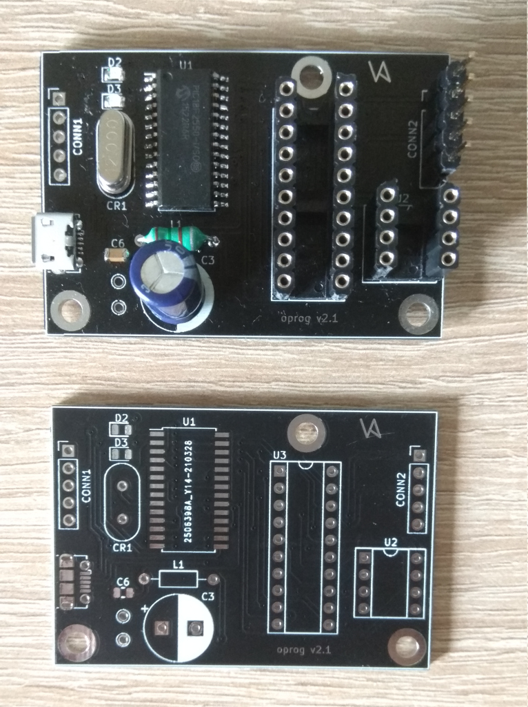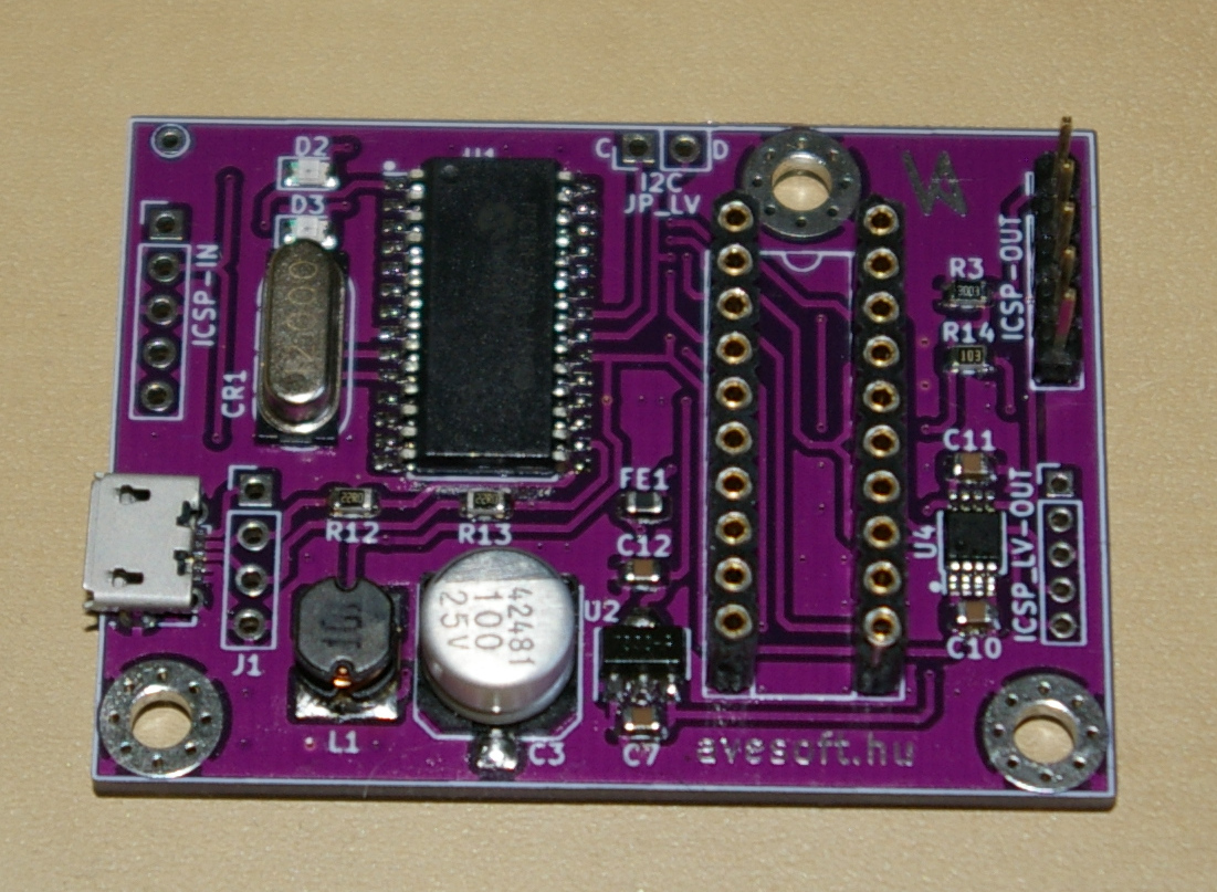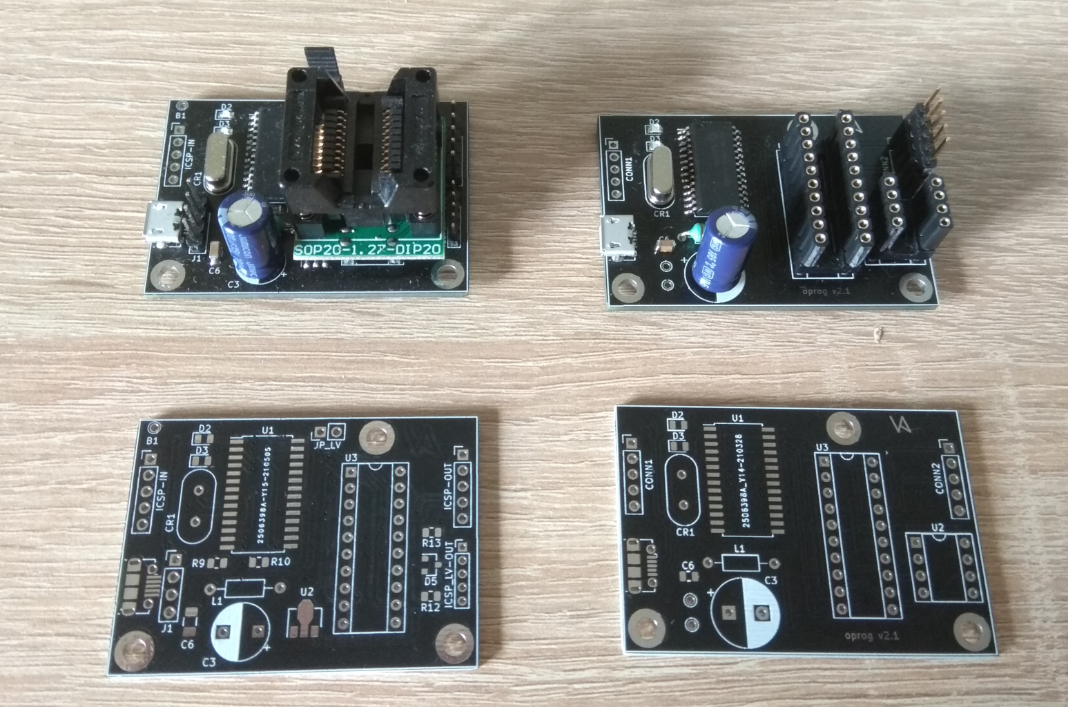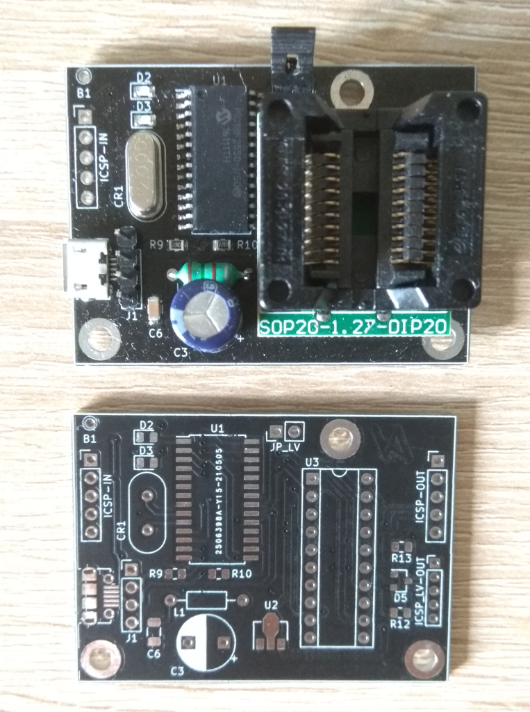 A hardware-ből több verziót is terveztem, illetve készítettem. Az egyik alkalmas i2c-s EEPROM-ok írására, a másikra ráintegráltam egy 3.3V-os szintillesztőt az alacsonyabb feszültségű PIC-ek írásához. Mindkettőn található egy-egy 20 lábú IC foglalat (DIL vagy SOP) is a gyakoribb PIC-ekhez.